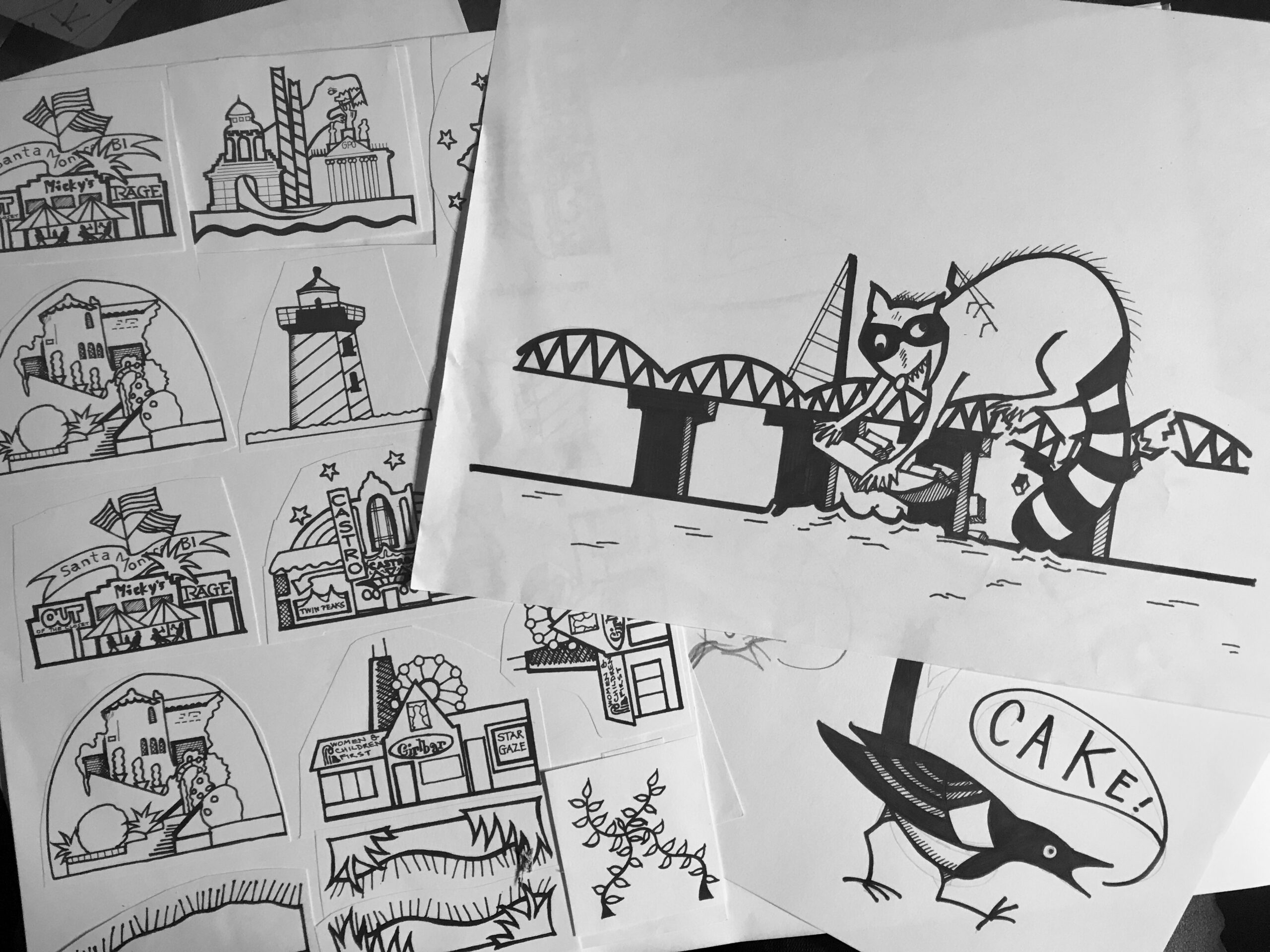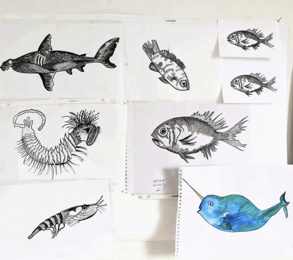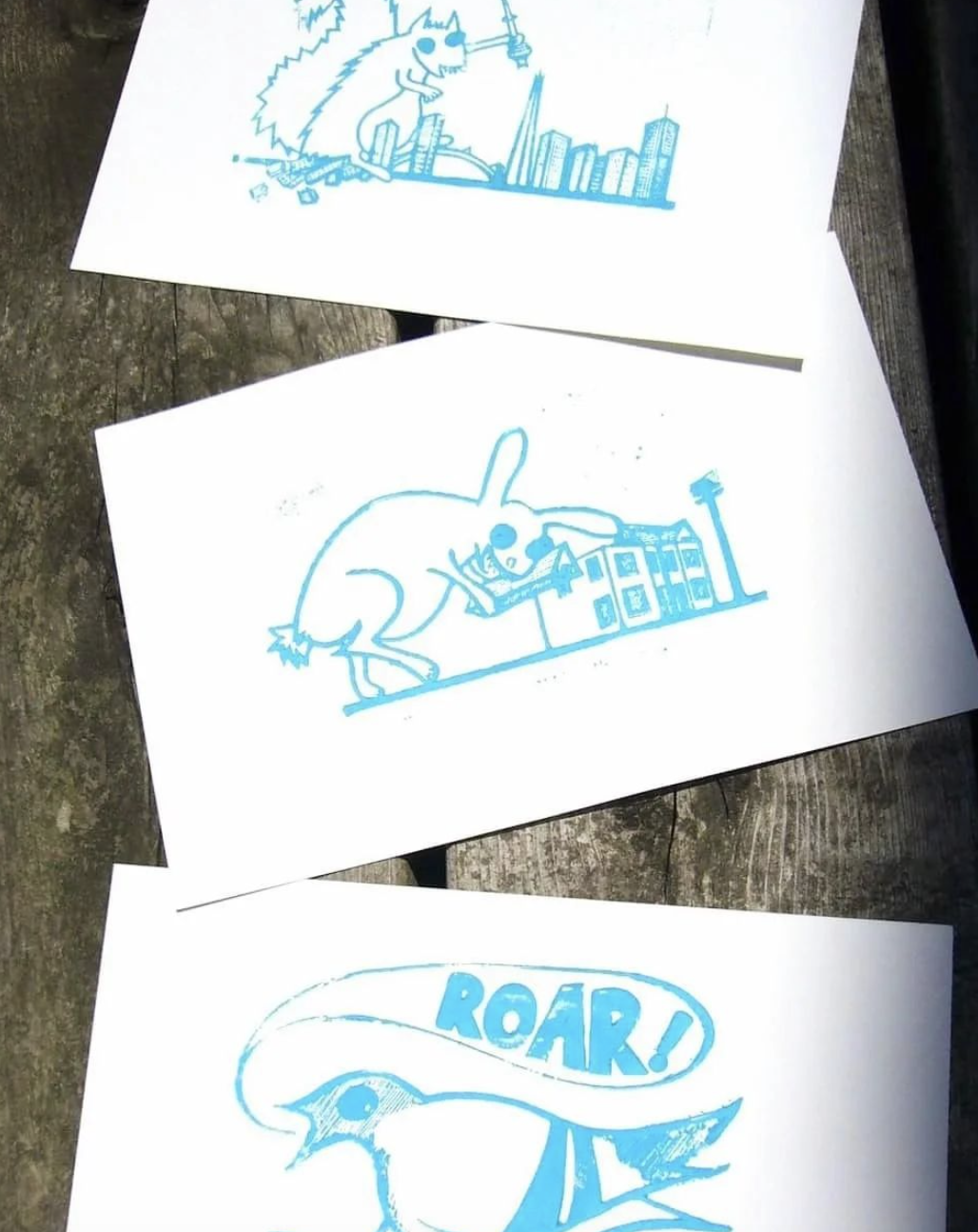 I do graphic design and illustration. I have worked as a mural painter, graphic designer, illustrator and snowglobe designer (I think the pug carousel was my favourite). I generally draw angry creatures; pigeons, bunnies, squirrels, raccoons, cat vampires… I am thinking about how best to capture the fury of the seahorse.